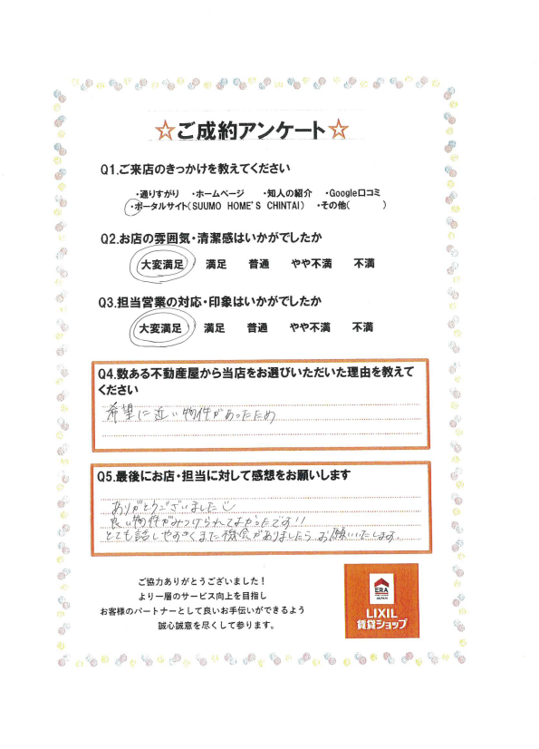 無事物件が決められましたこと大変嬉しく思います。