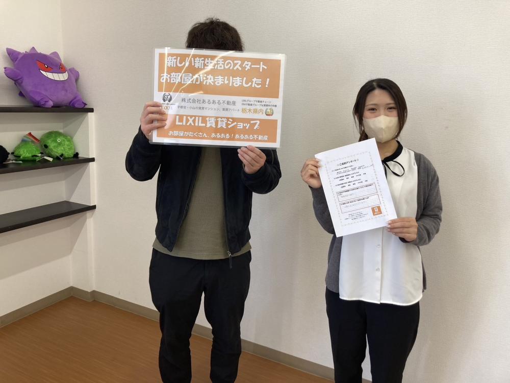 この度は数ある不動産の中からあるある不動産小山店をお選びいただきありがとうございました! 退去前でのお申込みでしたが、物件を気に入っていただけてよかったです(*´ω`*) 寒くなってきましたのでお引越し作業も大変かと思いますが、お身体には十分お気を付けください。 ご入居後でも分からないことなどございましたらお気軽にご連絡ください(^^)/ 今後ともよろしくお願いいたします。