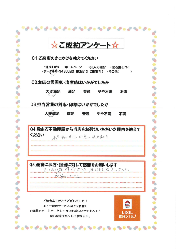 この度は弊社ご利用誠にありがとうございました。 無事お部屋が見つかって本当によかったです。他の方と違ったお引越し理由でしたが素敵な新生活をお送りされるよう心から応援しております。 改めて誠にありがとうございました。